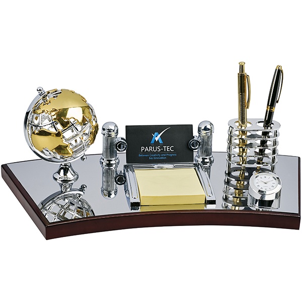 “קמור” מעמד שולחני מהודר עץ ומתכת עם גלובוס, שעון