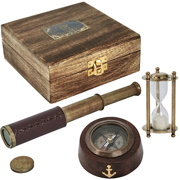 סט כולל מצפן, שעון חול וטלסקופ בקופסת עץ וינטג´