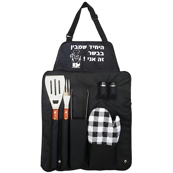 ערכת מנגל סינר עם כלים לברביקיו ,כיתוב "המבין בבשר"