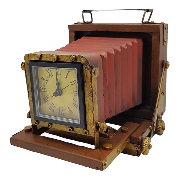 שעון שולחני בעיצוב רטרו מצלמת אקורדיון עם ידית נשיאה